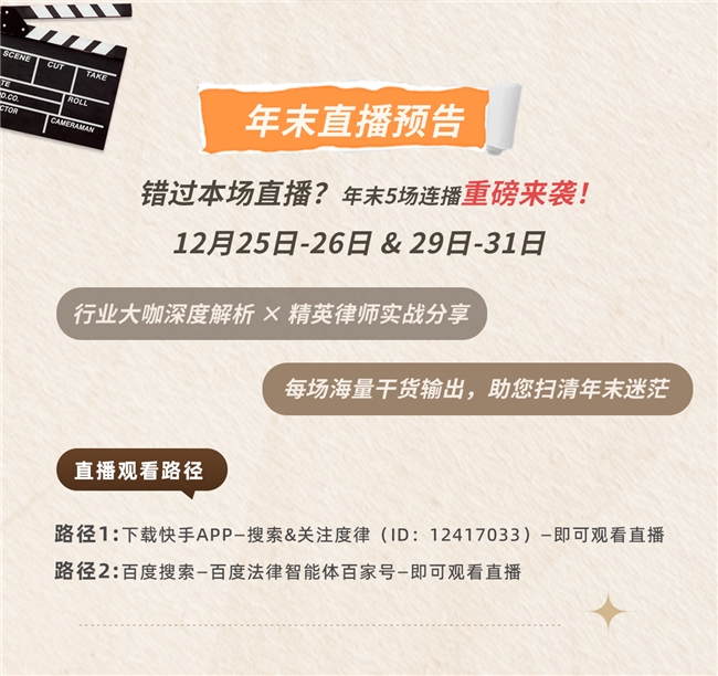 这场关于行业未来的探讨,只是百度法律智能体赋能旅程的起点。12月25日至12月31日,百度法律智能体将连续推出五场重磅直播,为法律从业者带来一场覆盖行业趋势、实战技巧与AI落地的“跨年盛宴”。从行业现状深度解析到人机协同范式揭秘,每一场直播都将为法律从业者的行业痛点提供精准解法。关注直播,与万千法律人共同见证AI如何重塑执业未来,在变革浪潮中抢占先机!